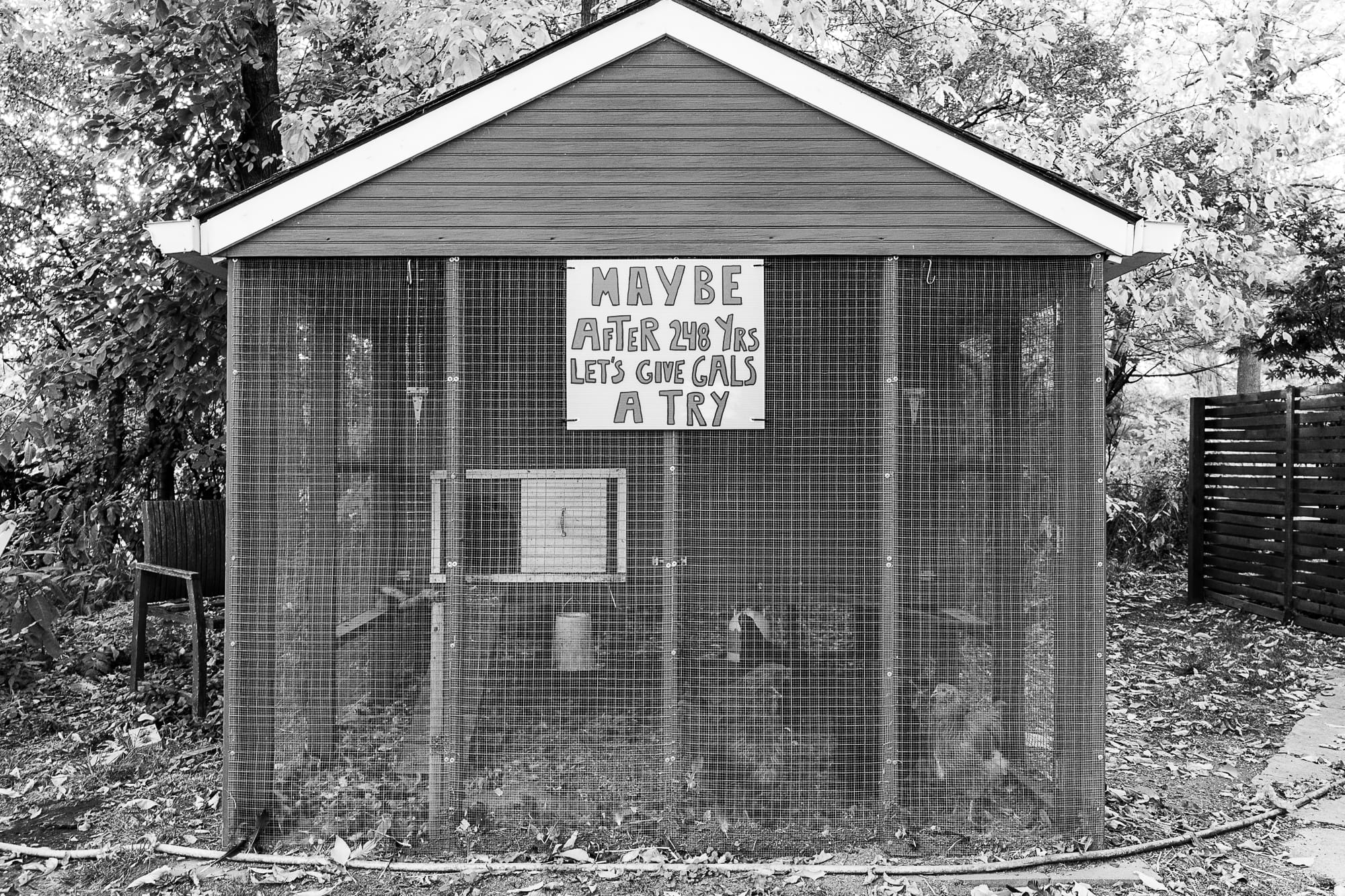 My walk today took me near friends' house, and I stopped by to visit them and their chickens. The chickens had a message for us "maybe after 248 yrs, let's give gals a try." So I took the photo below, and figured I should also take another photo of our effort at some campaign humor – our skeleton that reminds us that we can sleep when we're dead. There is little to laugh at in this election – but when we can make our point with humor, we have to do it.