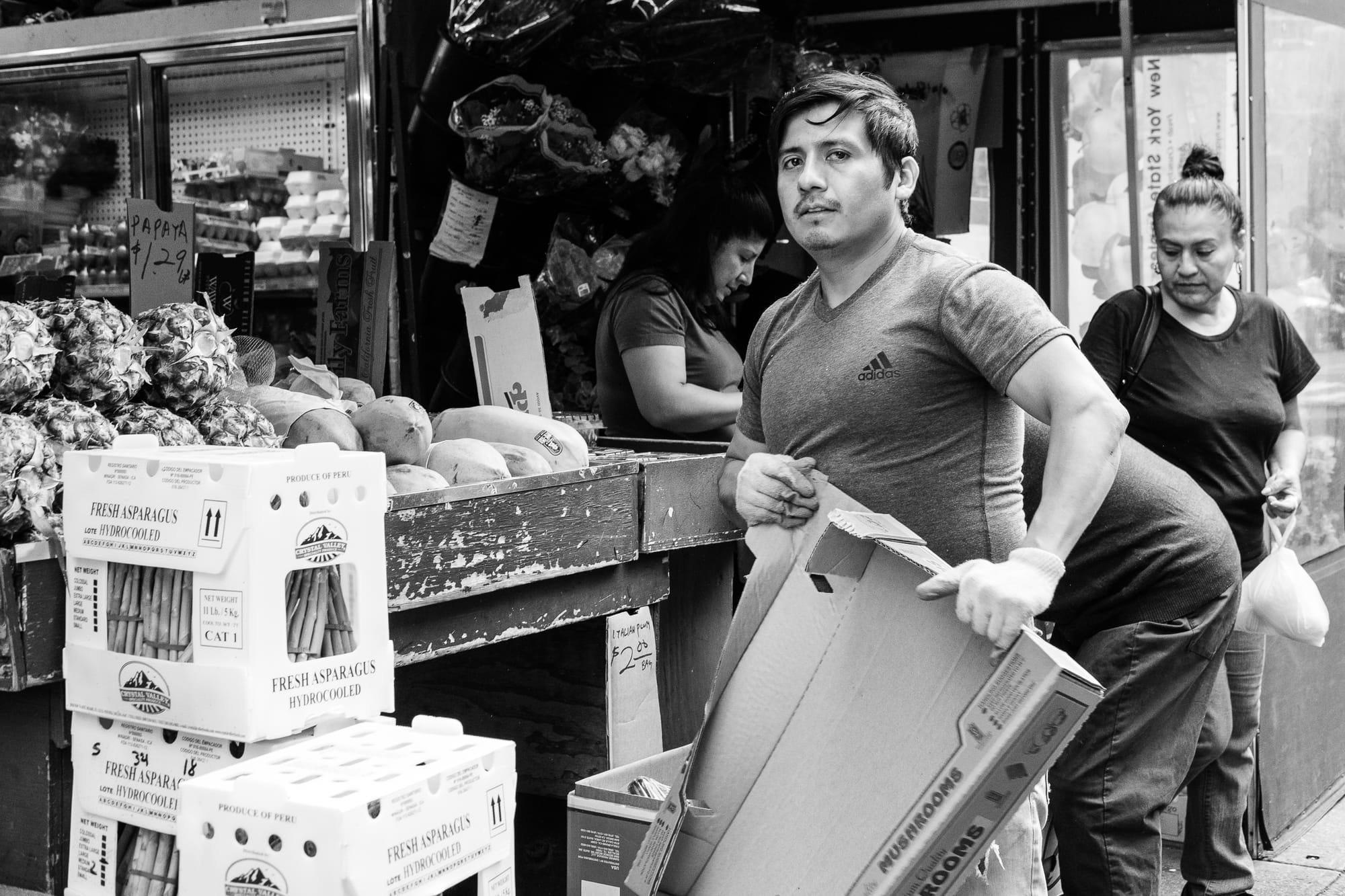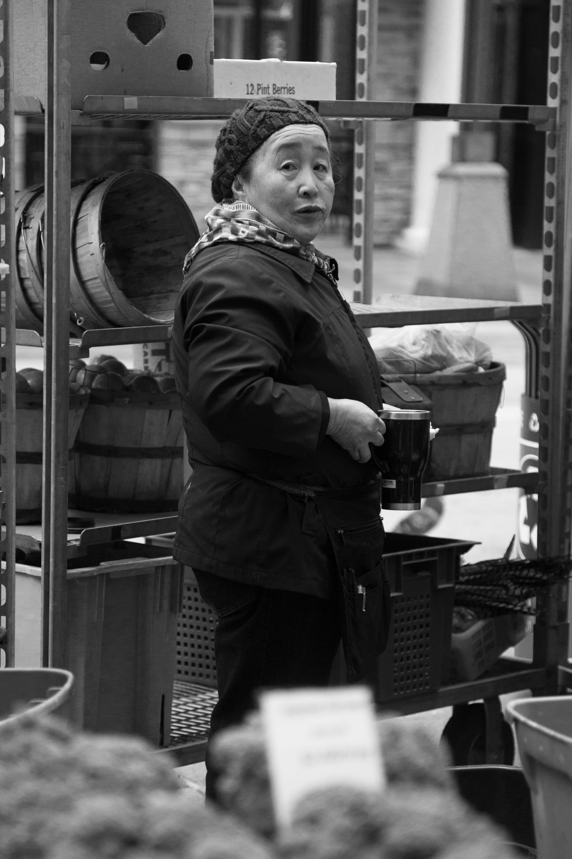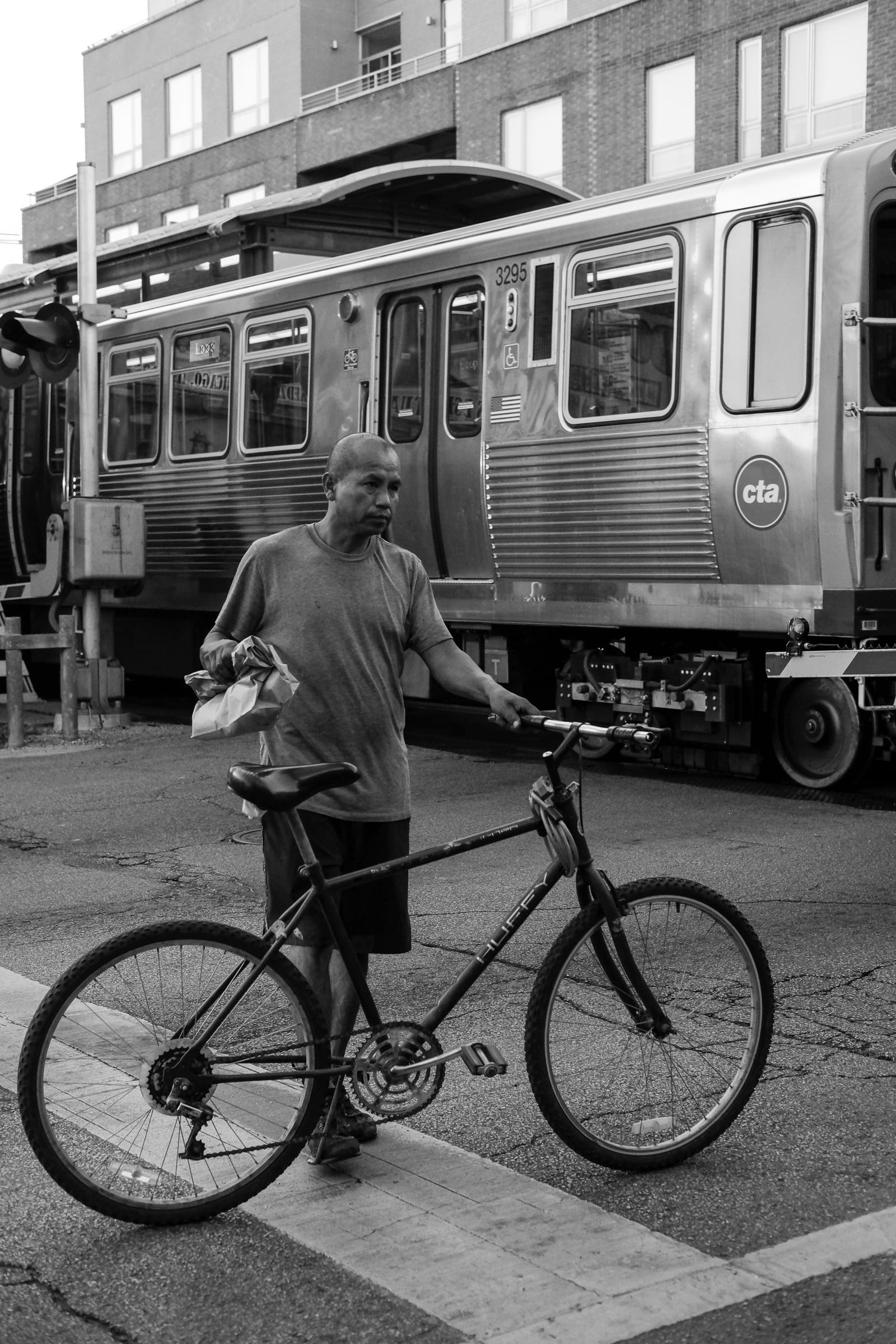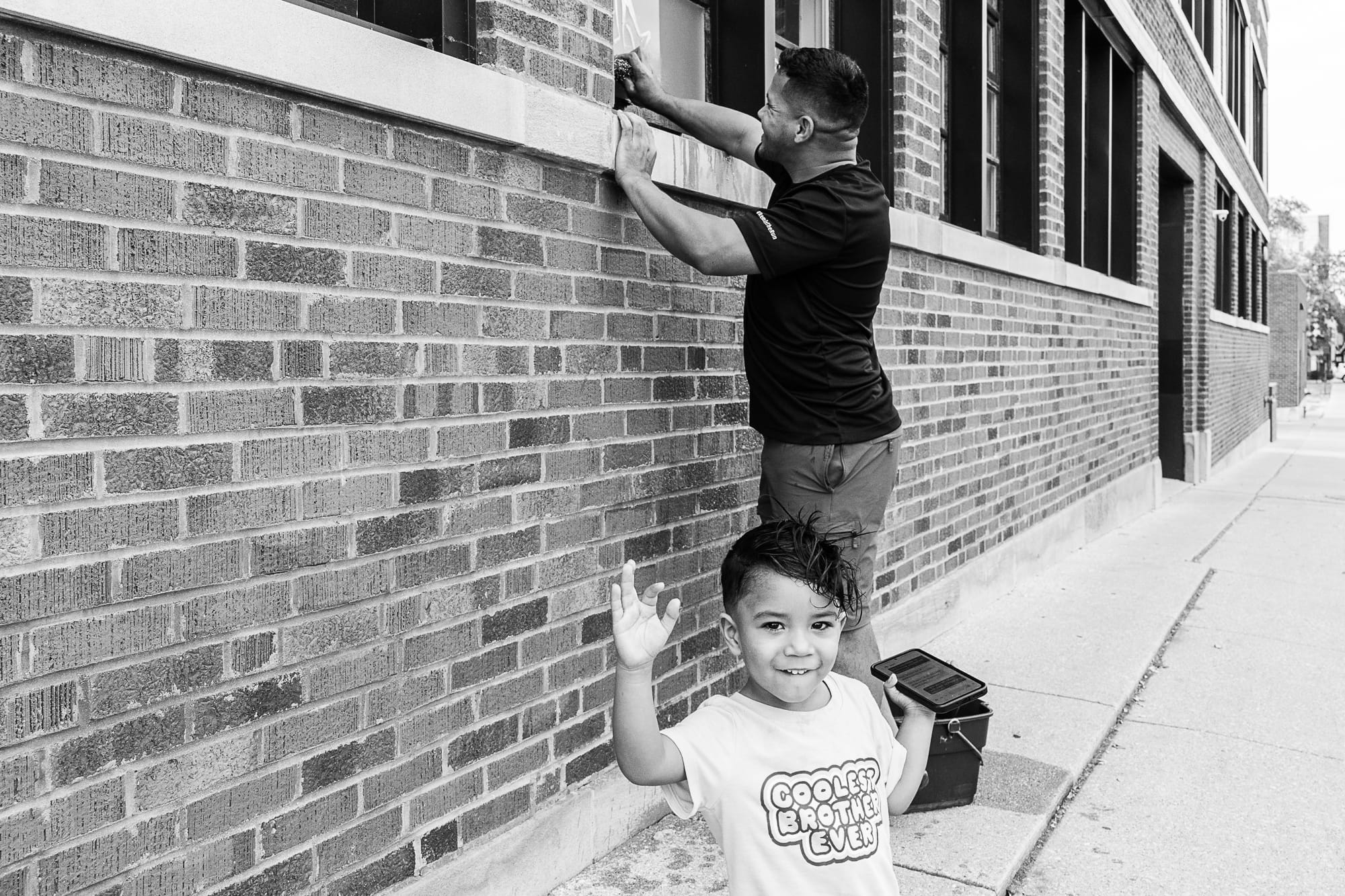 The photo above and the one below go together. As I was walking east on Lawrence, I saw someone working on the windows and wanted to get close to get his photo. But while he didn't look my way, this little boy, who I assume was his son, was totally watching me. So I took his photo – the one above. Then after I walked past I turned around to see if I could get a photo of the father – and his son again totally stole the show, which made us both laugh.
